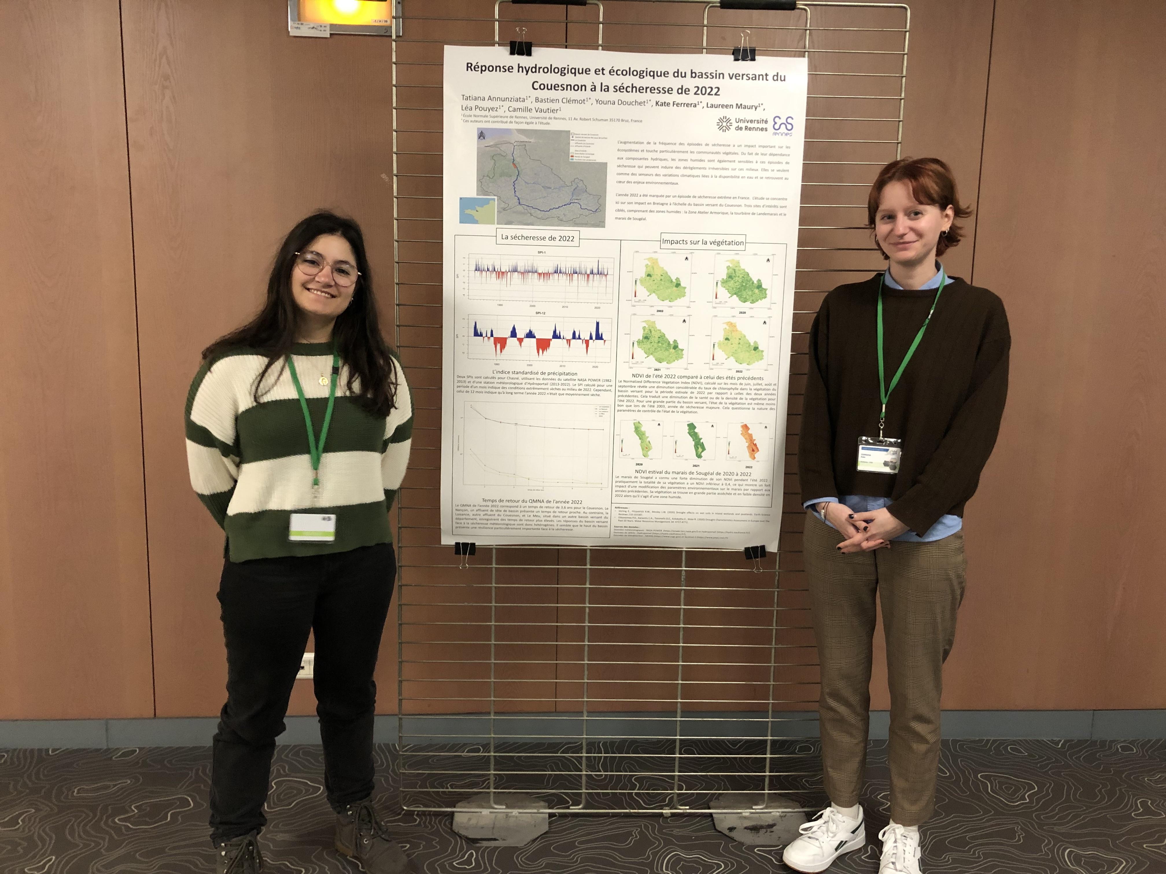 Laureen et Kate, deux étudiantes du PhD Track, ont présenté le projet de recherche au colloque de la Société Hydrotechnique de France à Chatou (78), qui portait sur la sécheresse 2022. Le poster avait été préparé par l'ensemble de la promotion et présentait les principales avancées du projet en hydrologie et en télédétection.